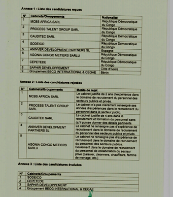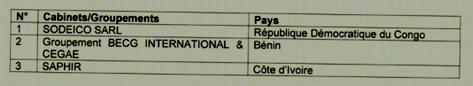 J’ai l’avantage de vous informer qu’à l’issue de l’évaluation des manifestations d’intérêt relative à la mission citée en exergue, les cabinets suivants classés par ordre alphabétique sont retenus sur la liste restreinte. Il s’agit de :
