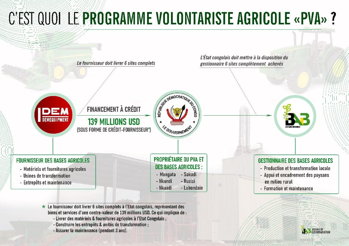 A son tour, l’Etat Congolais devrait livrer des sites achevés à la Bio Agro Business pour la production et transformation des produits agricoles (maïs, manioc et riz) ainsi que l’encadrement et l’accompagnement des paysans en milieux ruraux.