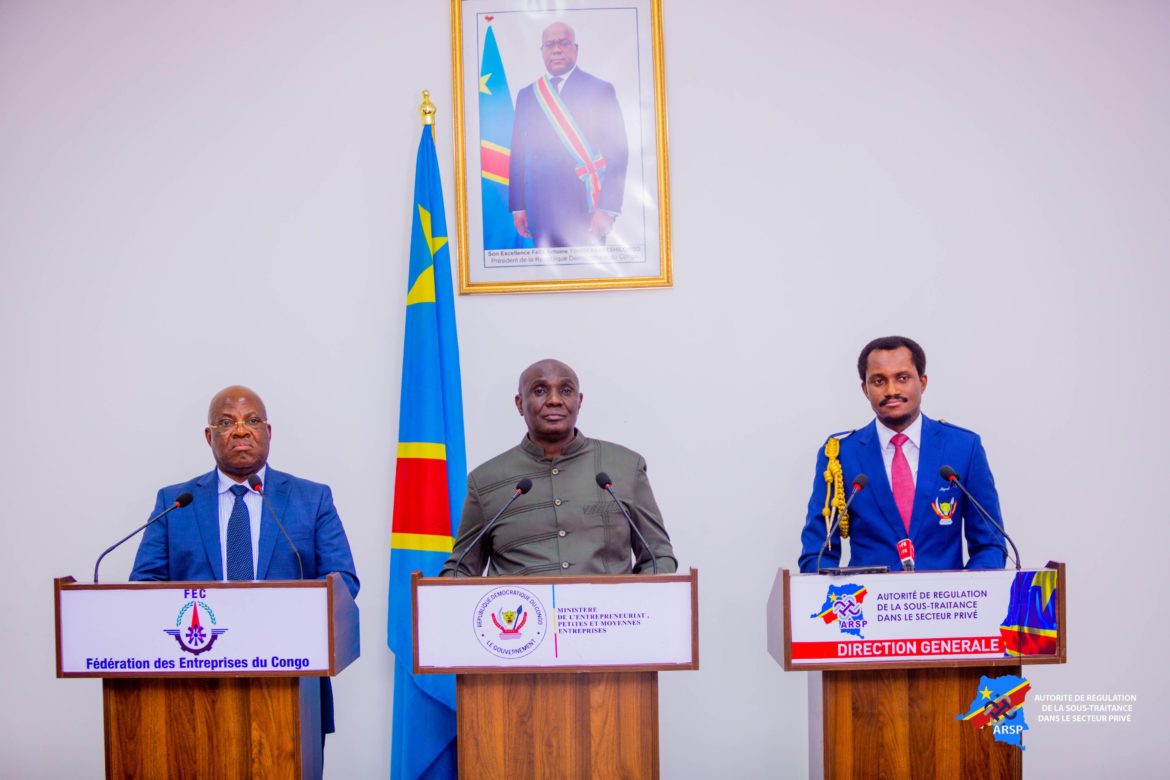 *Au cours d’une séance de travail organisé par le Ministre de l’Entrepreneuriat, des Petites et Moyennes Entreprises, M. Désiré N’zinga, le DG de l’ARSP Miguel Kashal Katemb et le Président National de la FEC Robert Malumba Kalombo ont décidé de mettre un terme à leurs divergences sur la recommandation des sous-traitants pour l’exécution des marchés au sein des entreprises principales de différents secteurs. Cette résolution a été prise après la réunion tripartite tenue à l’initiative du gouvernement.