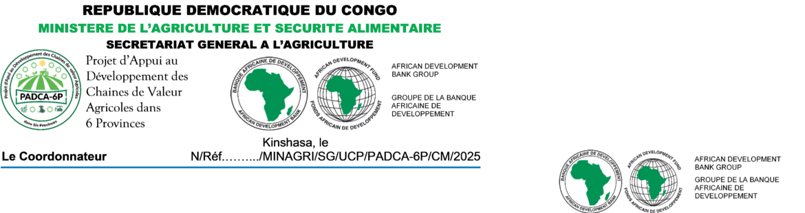 Le Gouvernement de la République Démocratique du Congo a reçu un financement du Groupe de la Banque Africaine de Développement (BAD) afin de couvrir le coût du Projet d’Appui au Développement des Chaines de valeur Agricoles dans 6 Provinces, et a l’intention d’utiliser une partie des sommes accordées au titre de ce prêt pour financer le contrat d’un Consultant Individuel pour la revue à mi-parcours du PADCA-6P.