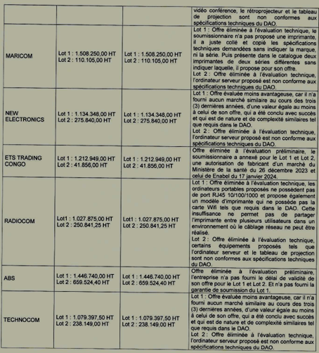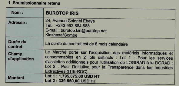 Intitulé du Marché : Acquisition des matériels informatiques et consommables en 2 lots distincts : Lot 1 : Pour les services d’assiettes additionnels pour l’utilisation du LOGIRAD à la DGRAD ; Lot 2 : Pour l’Initiative pour la Transparence dans les Industries Extractives (ITIE-RDC)