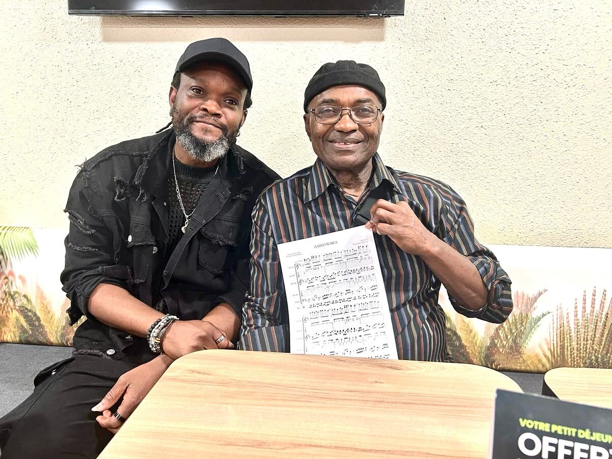 L’auteur du livre, Pythsens Kambilo, et son collègue Pépé Félly Manuaku, légende de la guitare, à Bruxelles