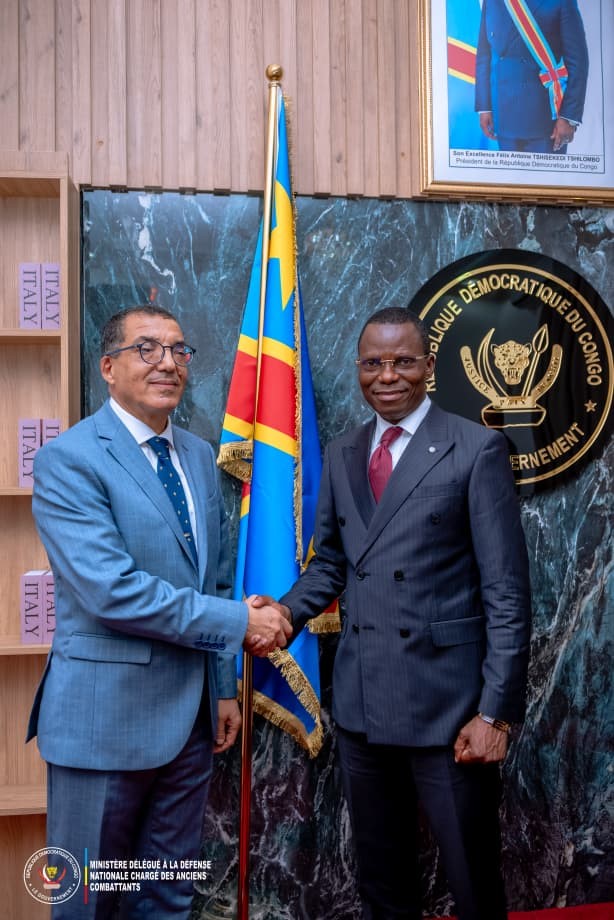 Kinshasa, le 27 novembre 2025. La République Démocratique du Congo sera bientôt dotée d’une loi portant statut des anciens combattants. Pour enrichir davantage le travail en cours, le Ministre délégué à la défense nationale Eliezer Ntambwe, initiateur dudit projet de loi, a sollicité l’expertise du Maroc par le biais de son ambassadeur en poste à Kinshasa. Le diplomate marocain Rachid Agassim a rassuré le Ministre délégué Eliezer Ntambwe de la disponibilité de son pays.