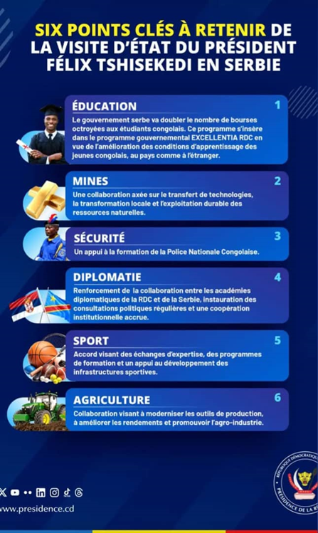 Ils ont discuté des importantes opportunités de développement de la coopération bilatérale dans divers domaines notamment dans le secteur de l’éducation grâce à l’octroi des bourses d’études aux étudiants congolais ; une collaboration axée sur le transfert de technologies, la formation et la modernisation des pratiques agricoles ; un appui à la formation de la Police Nationale Congolaise, et des projets pour le développement d’infrastructures sportives. Ces projets visent à soutenir le développement stratégique de la RDC et à exploiter son potentiel immense.