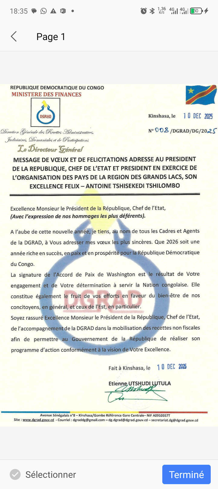 A l’aube de cette nouvelle année, je tiens, au nom de tous les Cadres et Agents de la DGRAD, à Vous adresser mes vœux les plus sincères. Que 2026 soit une année riche en succès, en paix et en prospérité pour la République Démocratique du Congo.
