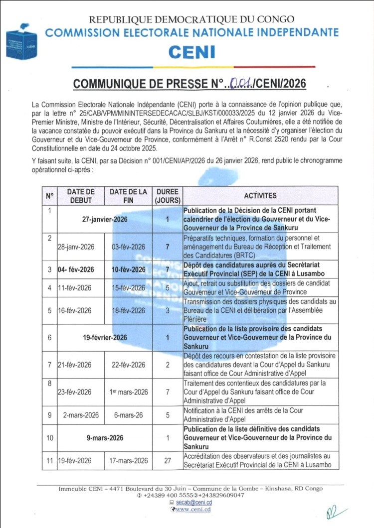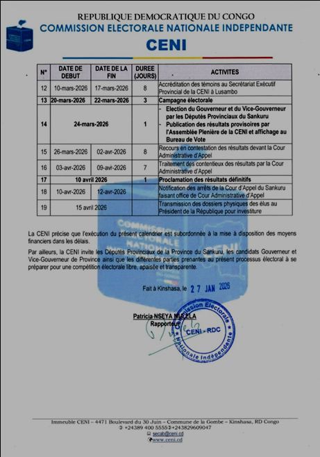 La CENI enclenche la vitesse supérieure au Sankuru. Dans un communiqué daté du 27 janvier 2026, la Centrale électorale a publié le chronogramme opérationnel devant conduire à l’élection du Gouverneur et du Vice-gouverneur de cette province, après la constatation de la vacance du pouvoir exécutif provincial. Du dépôt des candidatures à Lusambo prévue du 4 au 10 février à la publication de la liste définitive le 9 mars, en passant par la campagne du 20 au 22 mars et le scrutin fixé au 24 mars 2026 par les Députés provinciaux, le calendrier déroule une séquence serrée, avec proclamation des résultats définitifs annoncée pour le 10 avril 2026. La CENI avertit toutefois que l’exécution de ces opérations reste conditionnée à la mise à disposition des moyens financiers dans les délais, tout en appelant les parties prenantes à une compétition libre, apaisée et transparente.
