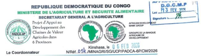 | A.1.2. Travaux de construction des plateformes multifonctionnelles dans la Province du Kwilu | BAD | AON | Prévision | 20/02/26 | 09/03/26 | 12/03/26 | 13/04/26 | 28/04/26 | 13/05/26 | 18/05/26 | 25/05/26 | 09/06/26 | 19/06/26 | 22/06/26 | 13/07/26 | 08/01/27 | ||||||||||||||||||||||